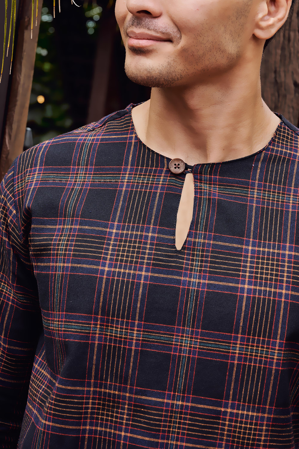 - Round neckline with special detailed EXCLUSIVE A&A CUSTOM MADE WOODEN BUTTON.