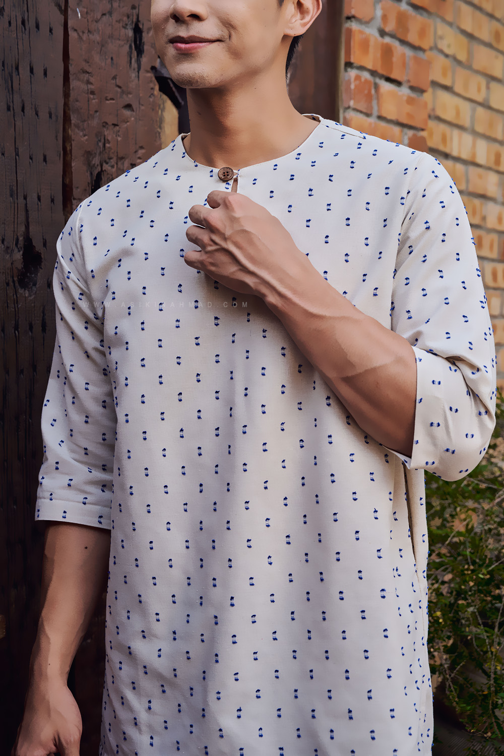 - Round neckline with special detailed EXCLUSIVE A&A CUSTOM MADE WOODEN BUTTON.