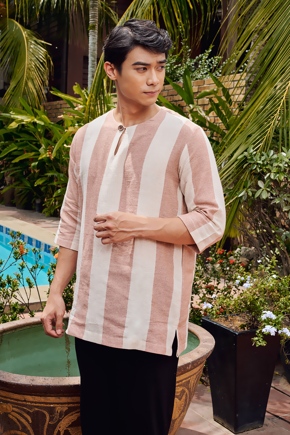 - Round neckline with special detailed EXCLUSIVE A&A CUSTOM MADE WOODEN BUTTON.