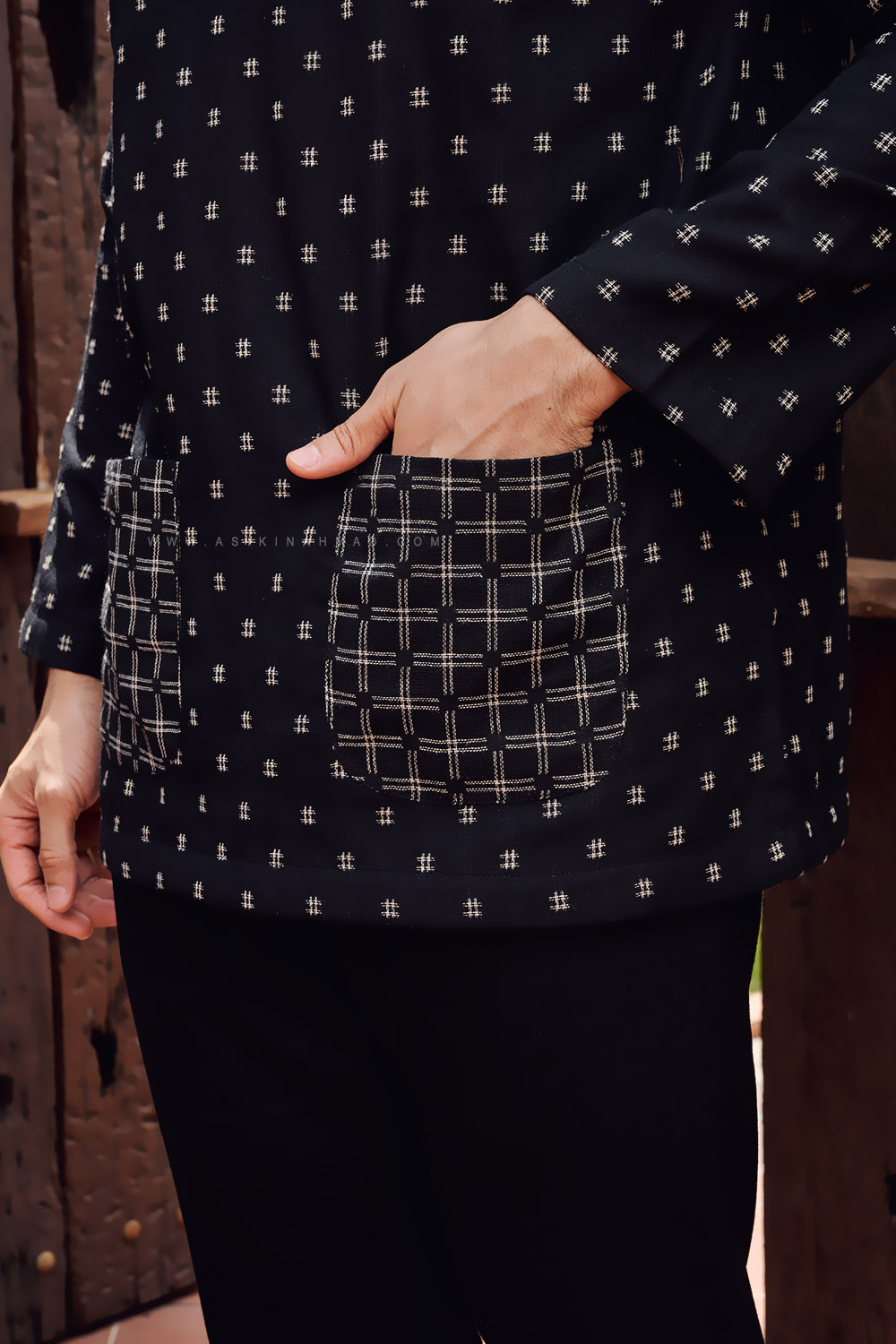 - Round neckline with special detailed EXCLUSIVE A&A CUSTOM MADE WOODEN BUTTON.