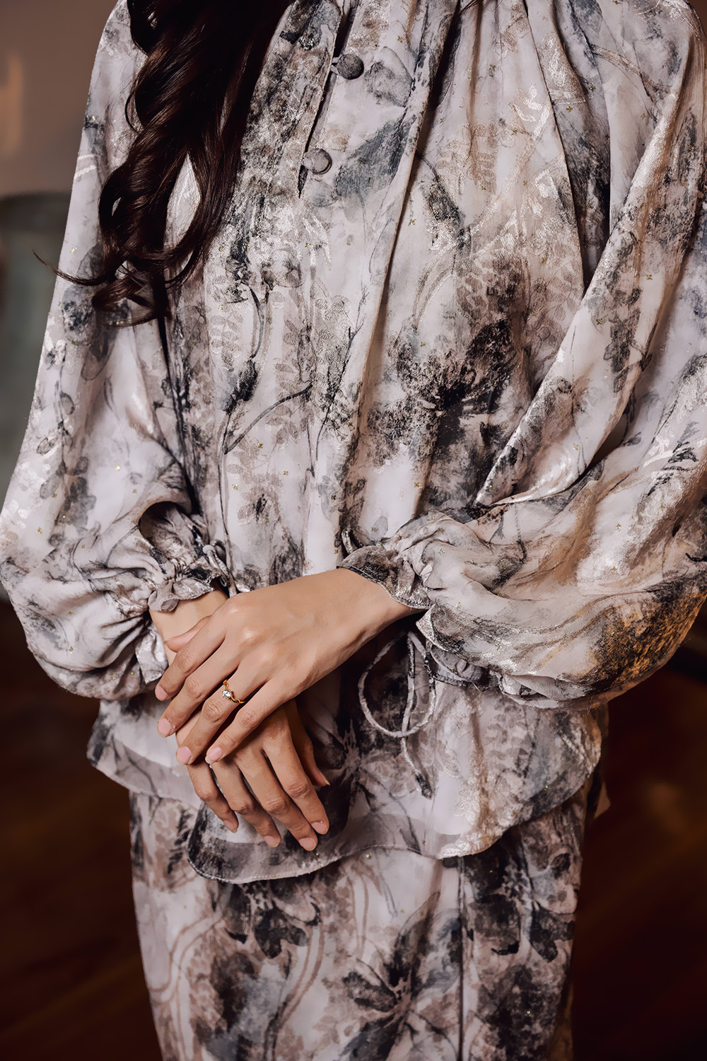 * Long puff sleeves with adjustable tie details at the wrist