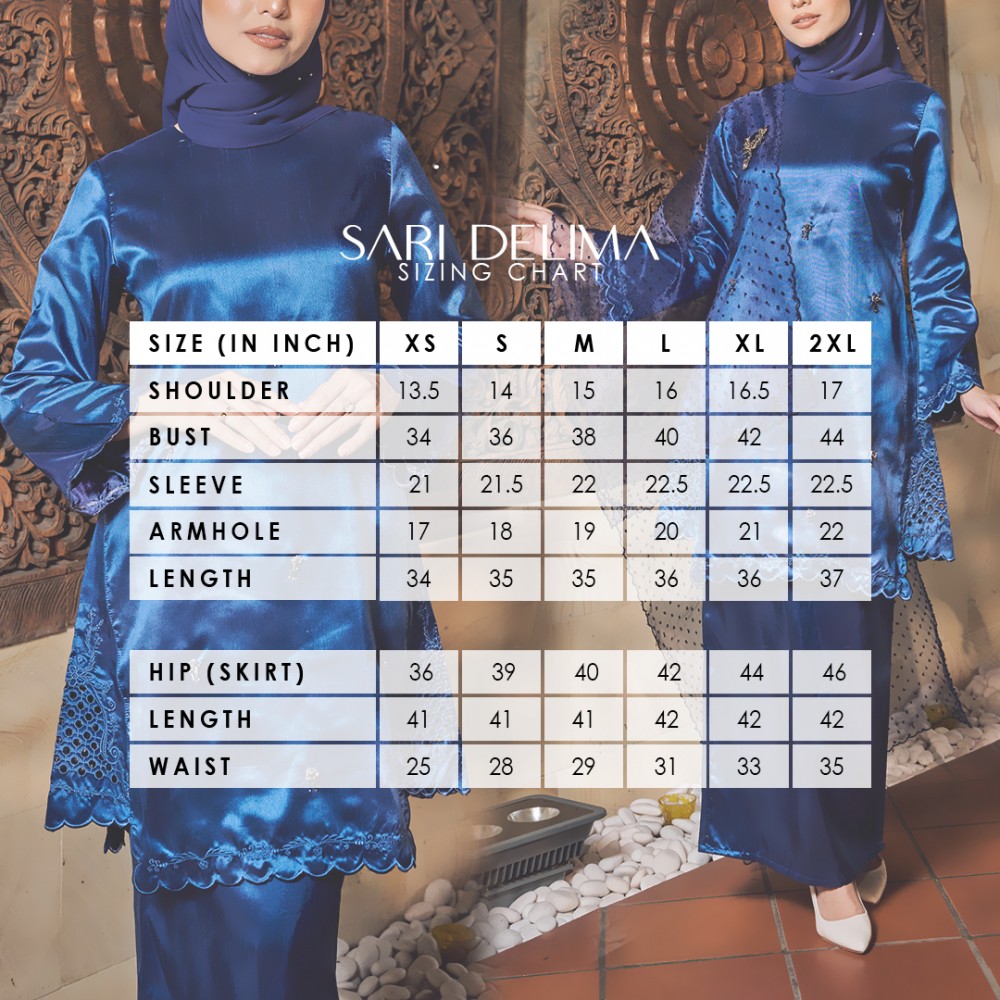 Material : Shantung Silk with traditional elegance with refined modern detailing with silhouette drapes beautifully while maintaining its structured charm. Enhanced with sulam tebuk and premium hand beading, the top exudes timeless sophistication.