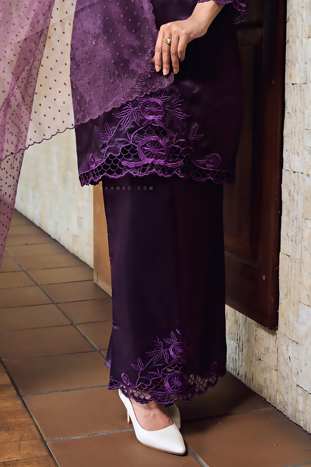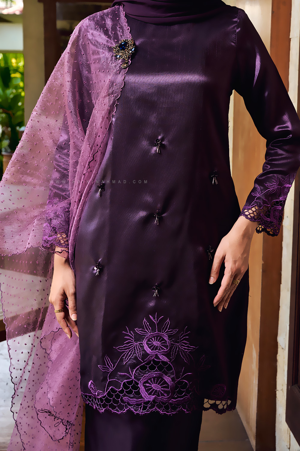 * Detailed with matching sulam tebuk embroidery at the hem.