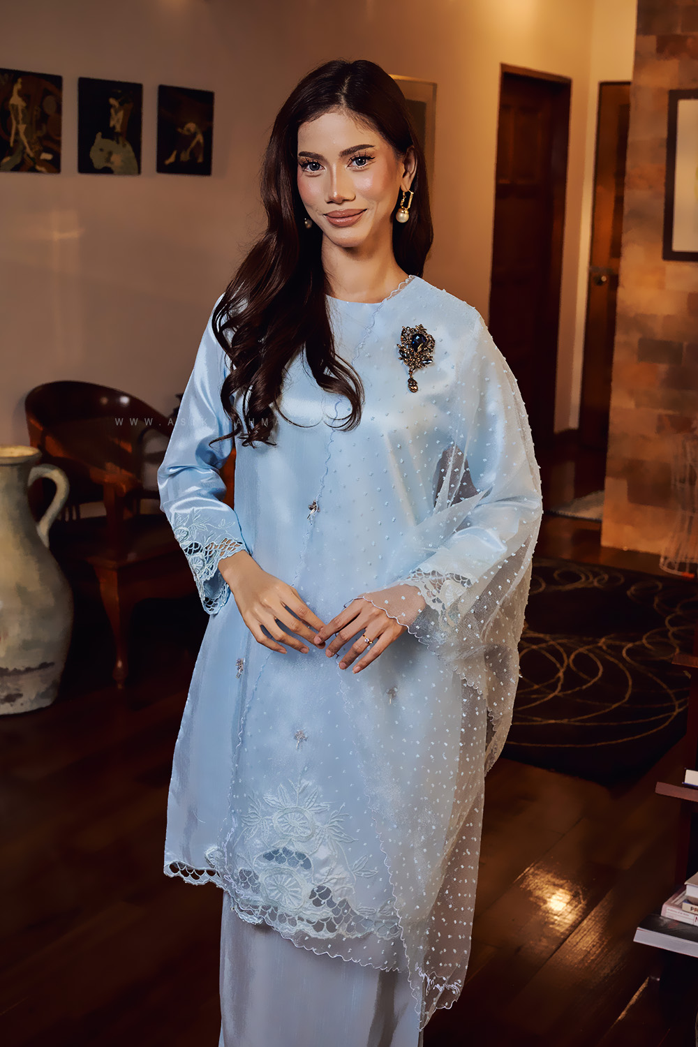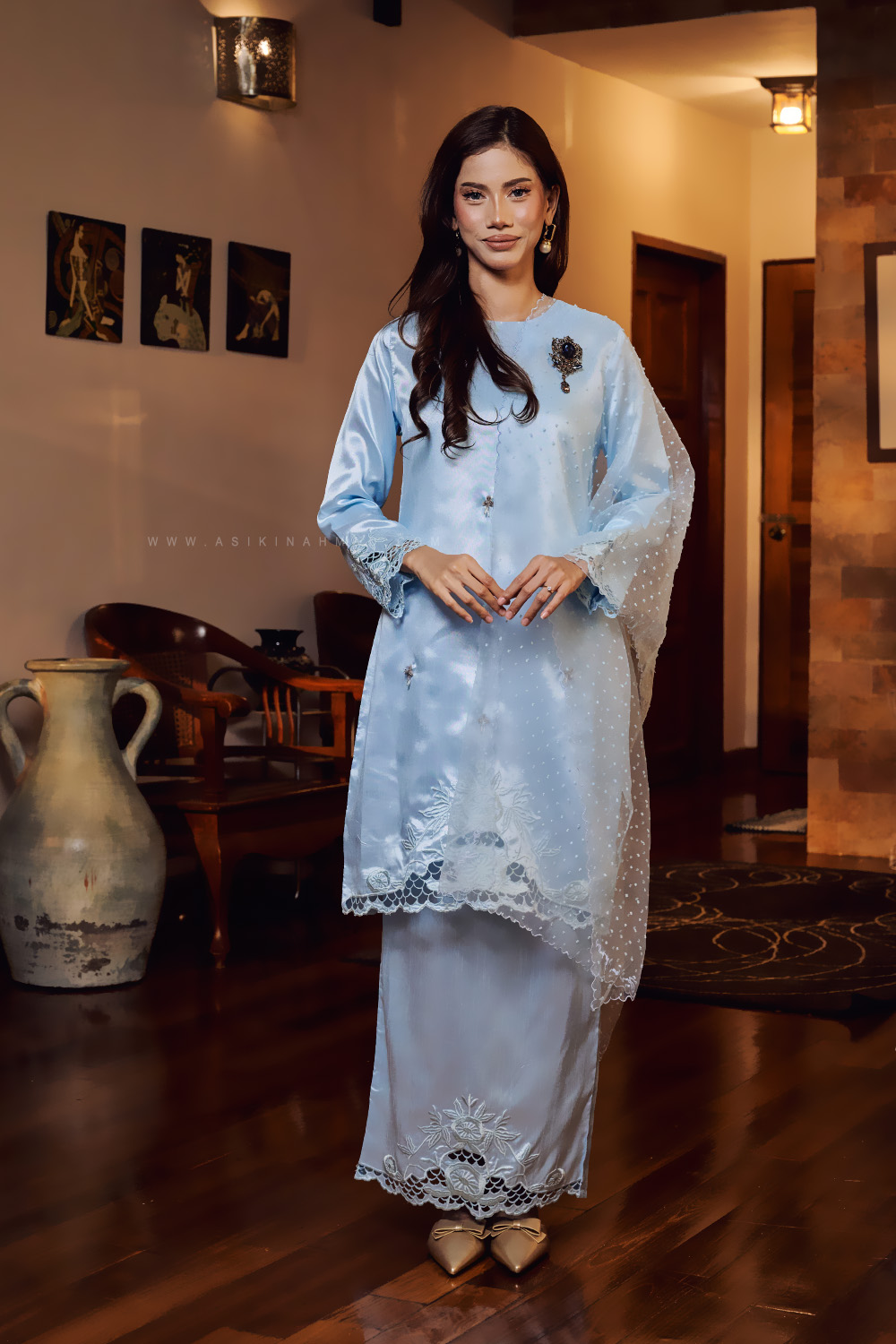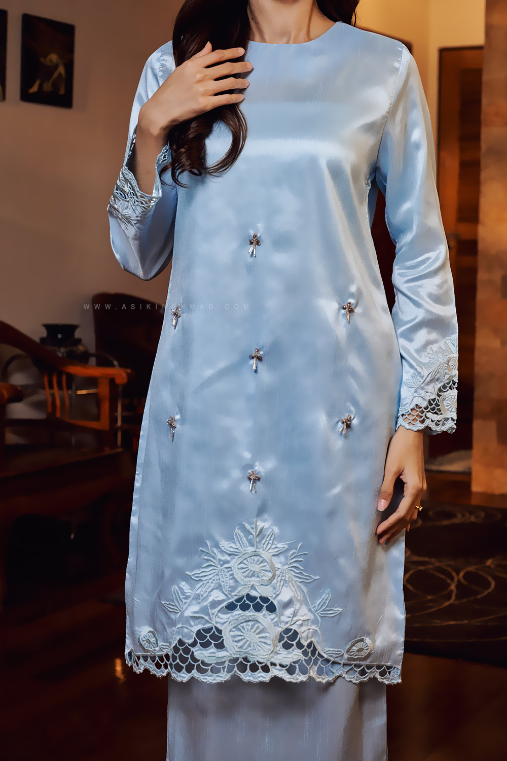 * Detailed with matching sulam tebuk embroidery at the hem.