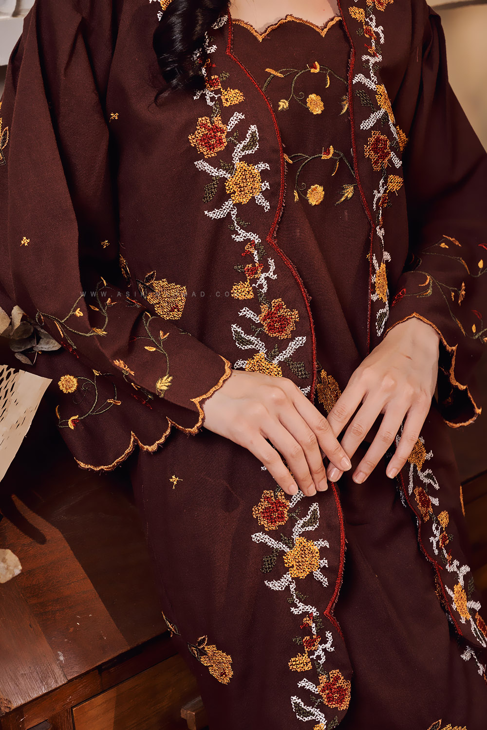 * Cross-stitch embroidery detailing along the front-side of the skirt